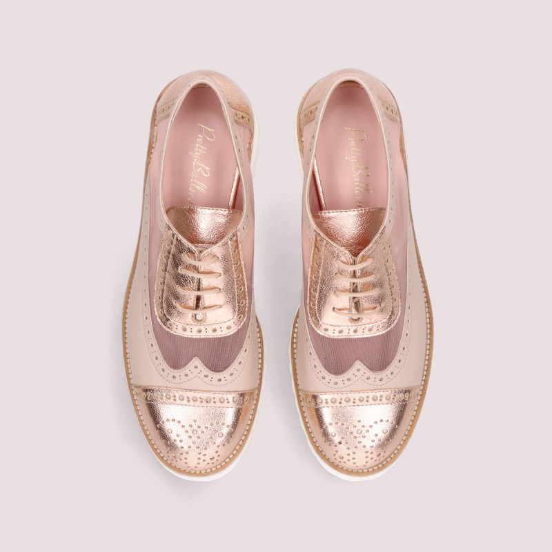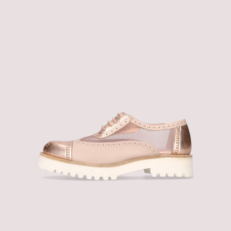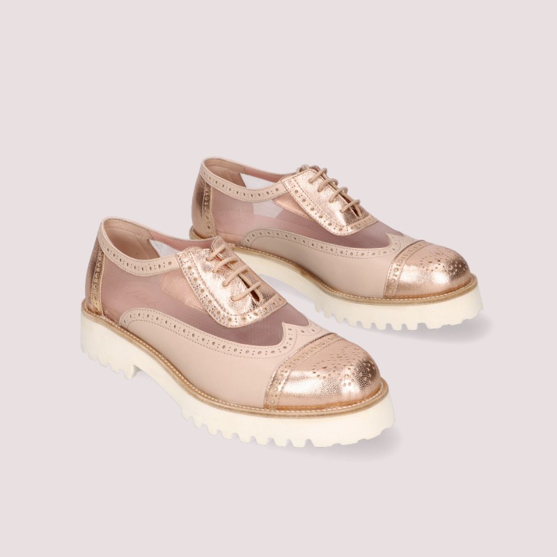 Lace up oxford in Nude and gold leather, mesh detail with a very light white sole.