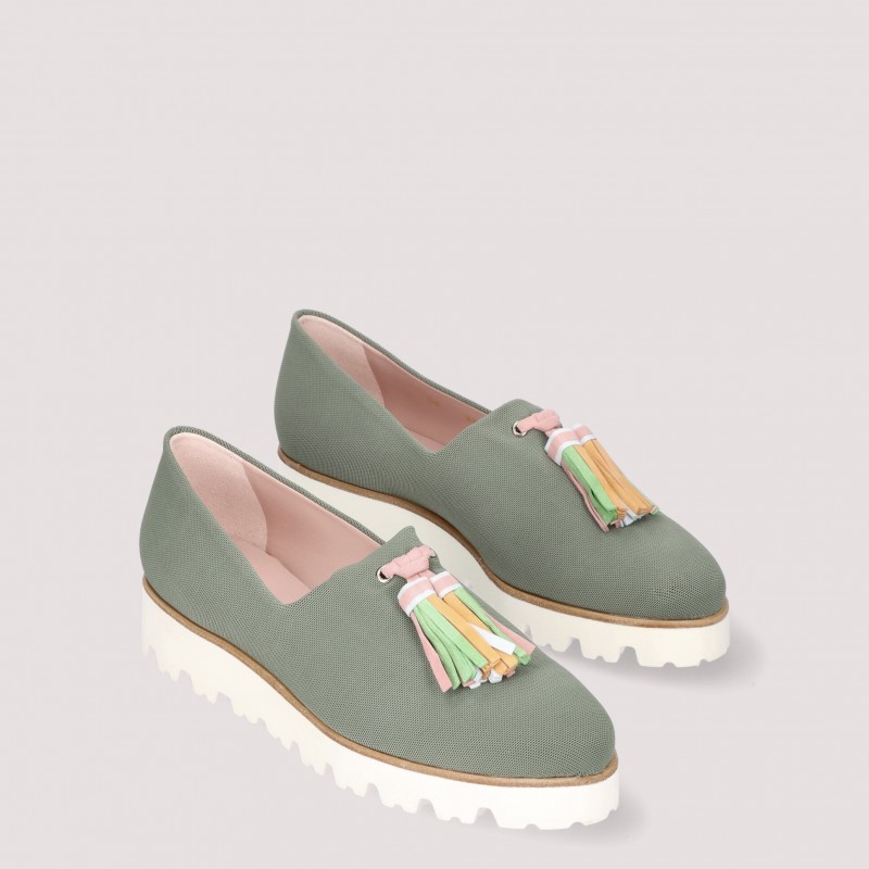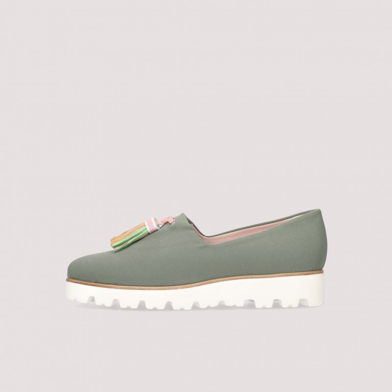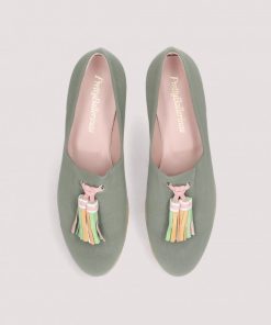 For the Charlize lovers, this only gets better! Your favorite light weight travel-loafer in sage green with colorful mustard, pink and mint suede tassels