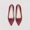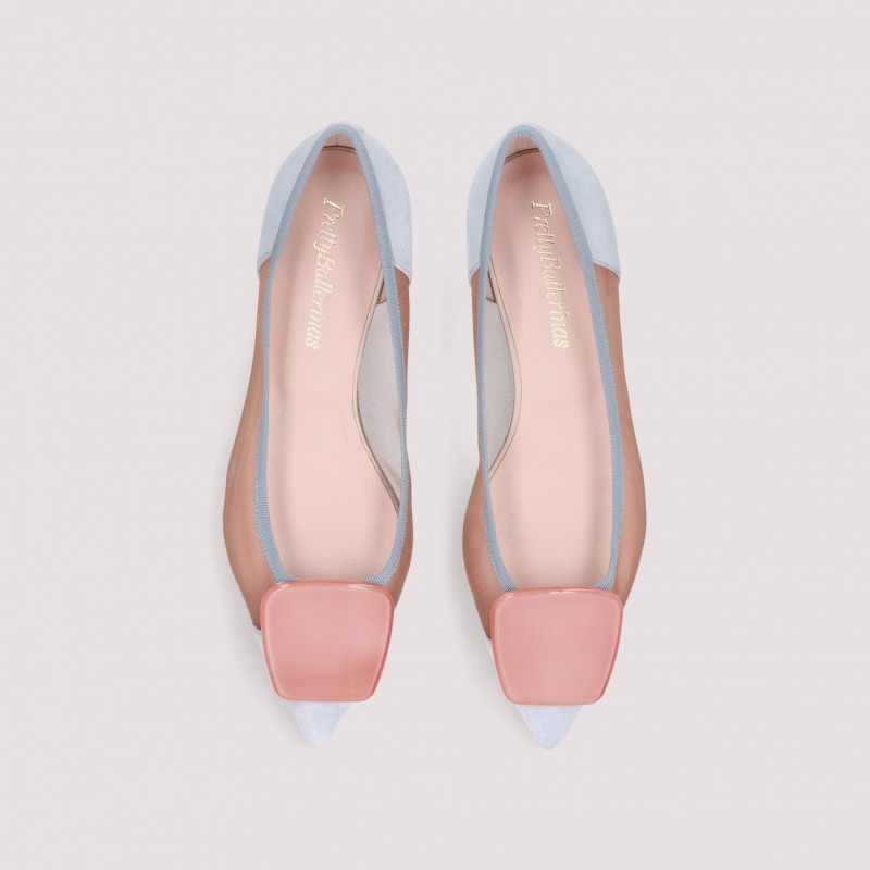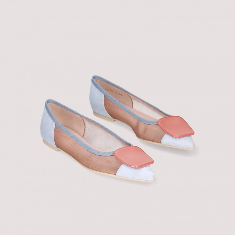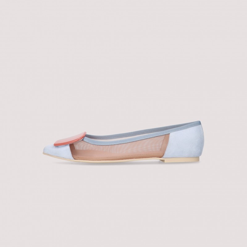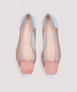 Pointed toe ballerina Ella in rusty orange mesh with baby blue leather toe cap and heel and square coral buckle detail. Rubber soles.