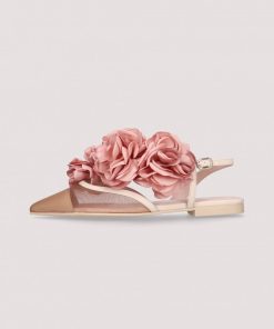 Slingback Ella in coral mesh with coral leather details, gold buckle and coral satin flower. Welcome Spring!