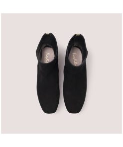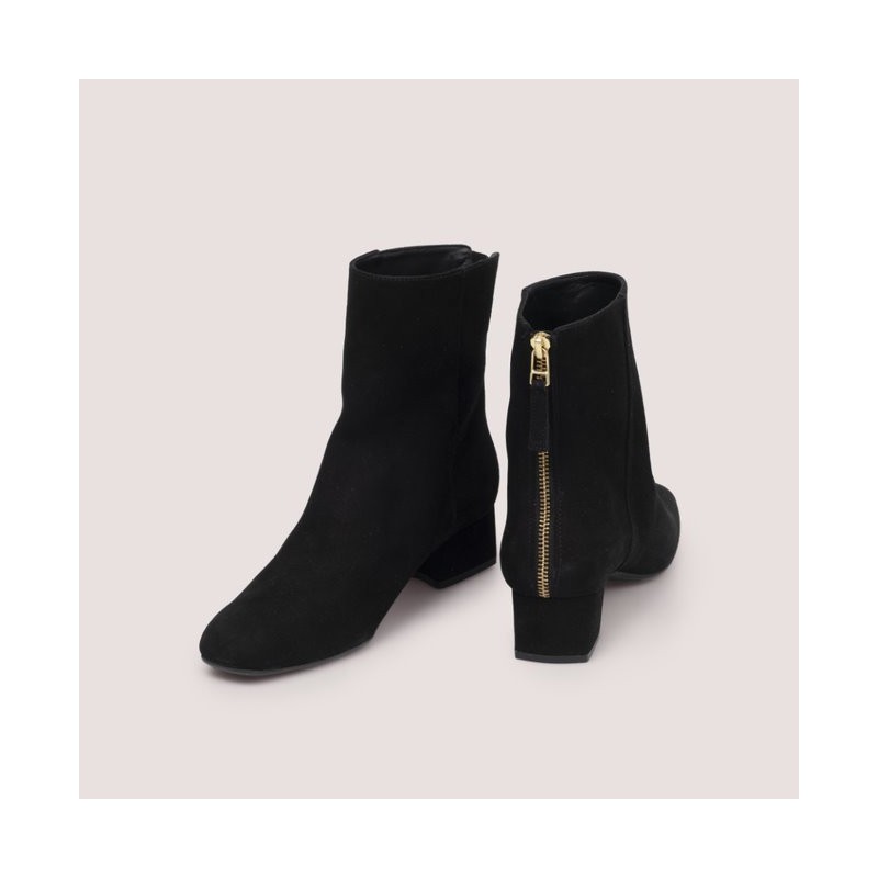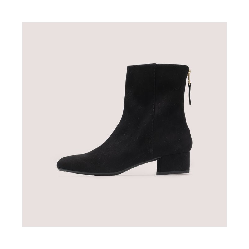 Short boot with back zipper and 2 inches heel in black suede. A winter trend keeping it classy