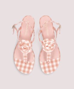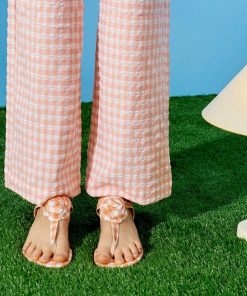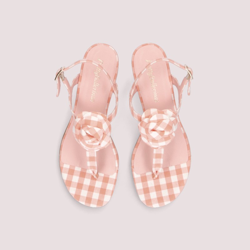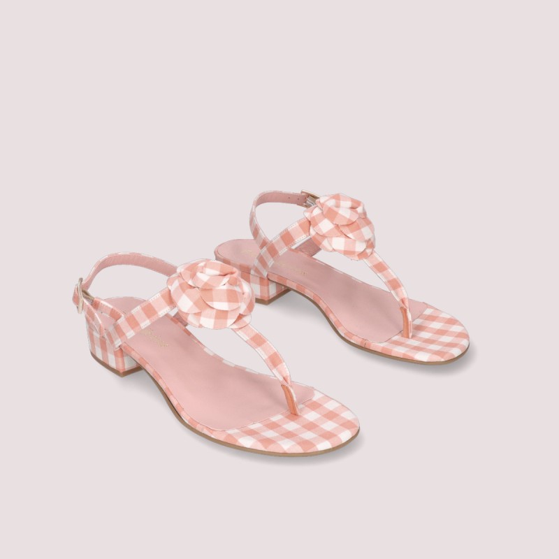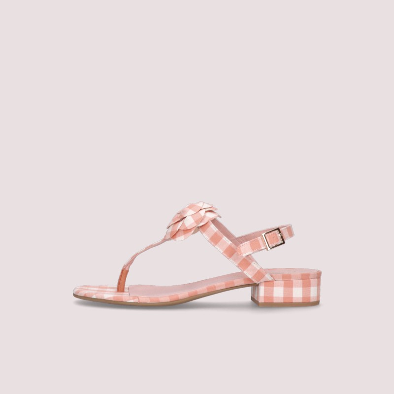Lulu Sandal have one inch heel. Gingham in coral and white patern made of organic cotton and soft leather lining
