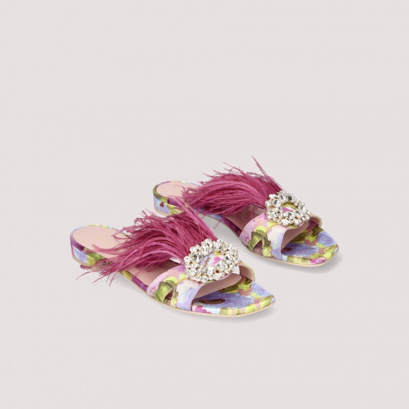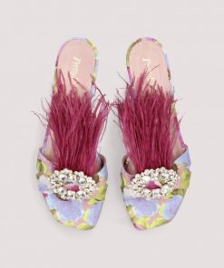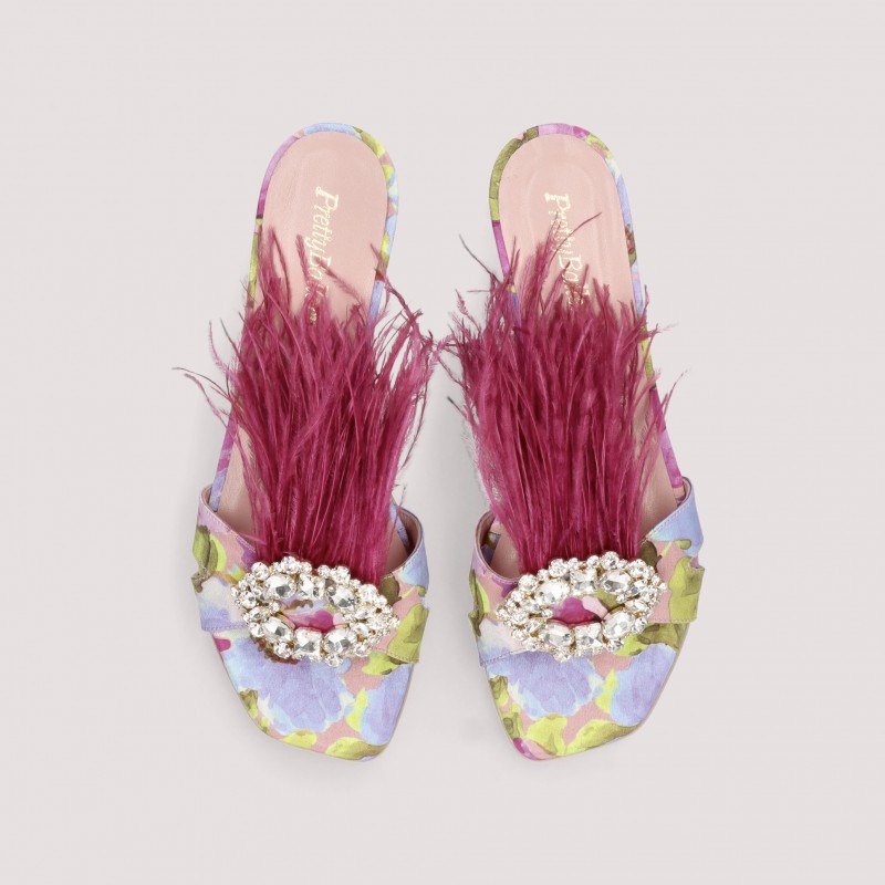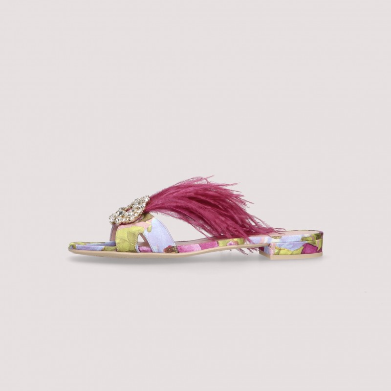 Sandal/Mule Lulu in floral printed multicolor silk featuring a Swarovsky brooch and peacock magenta feathers. Make the statement of the new season.