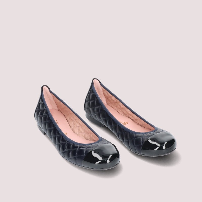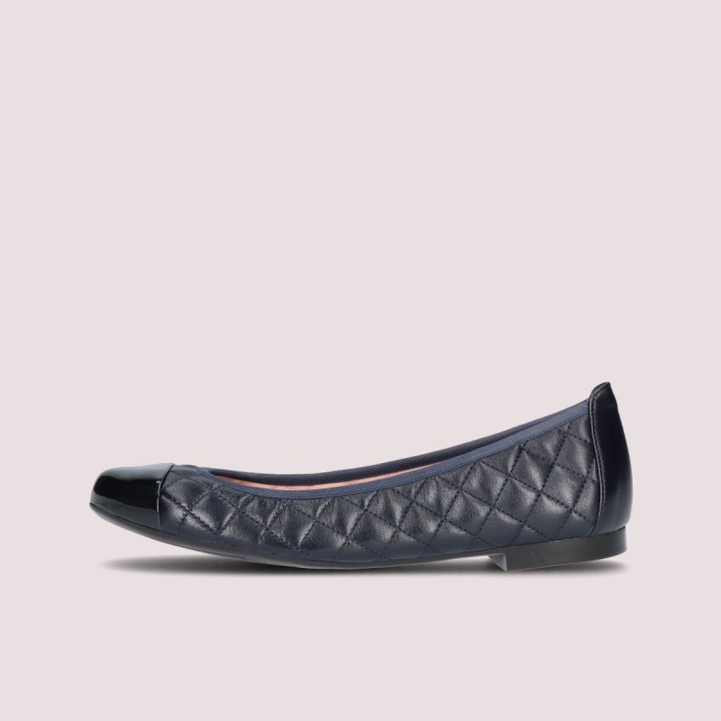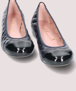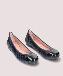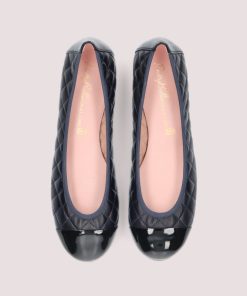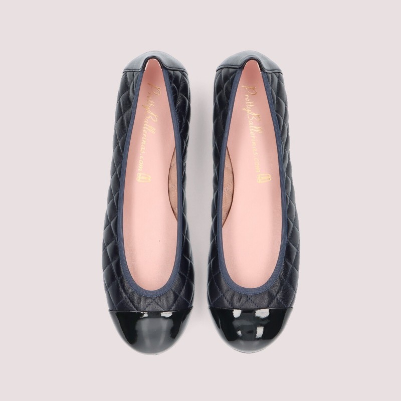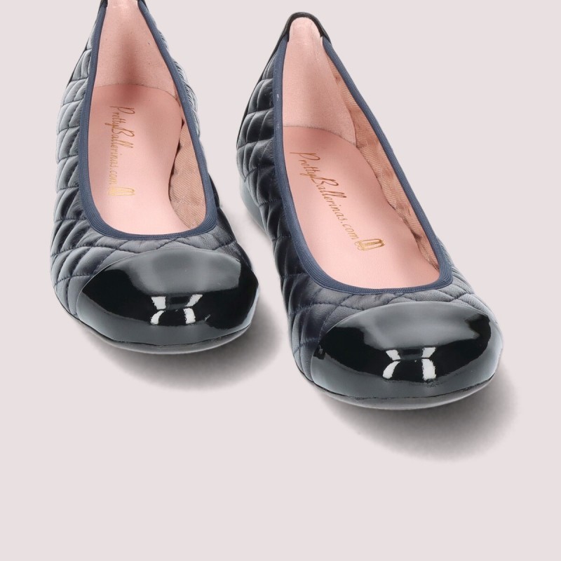 Soft bendy ballerina with 1/4 inch of heel. Quilted navy blue leather with navy patent toe. . Runs small, we suggest you to buy 1/2 size up